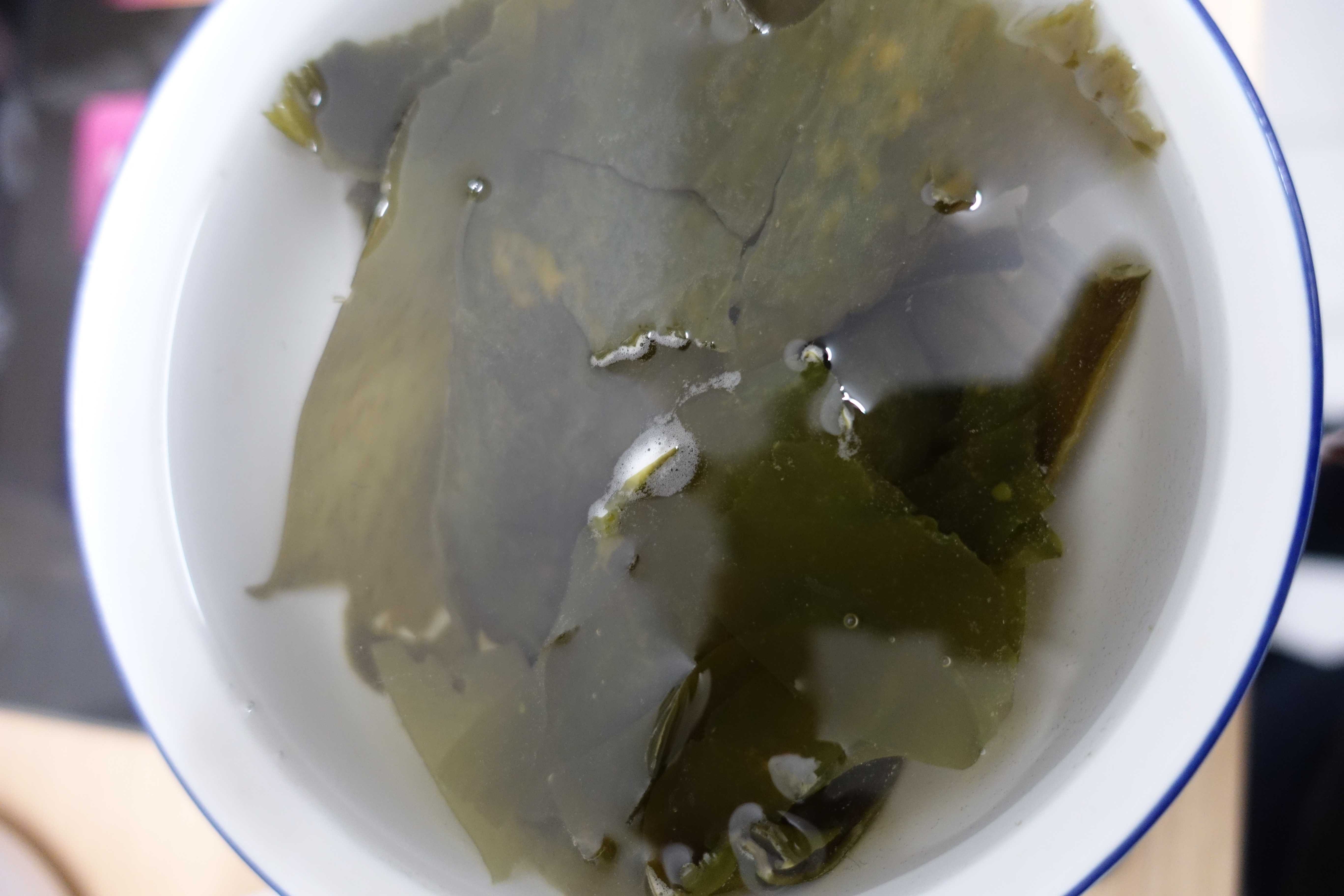 For the dashi, put a few leaves of kombu in a pot of lukewarm water, make simmer for 20-30 minutes, but don’t bring to a boil, otherwise the dashi will become bitter.